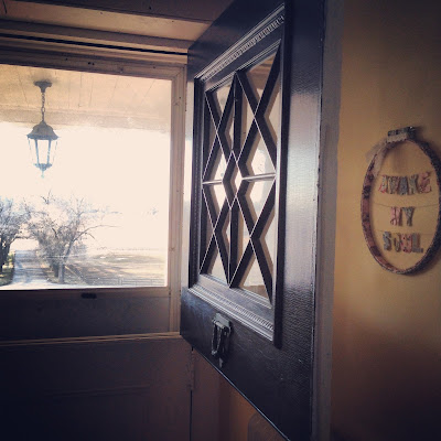 this huge dutch door is remarkable. the view outside is amazing, the front hill goes down to the tree lined driveway, and there is a huge field across the street. when the weather is warmer the breeze that comes through this door keeps the house cool.
